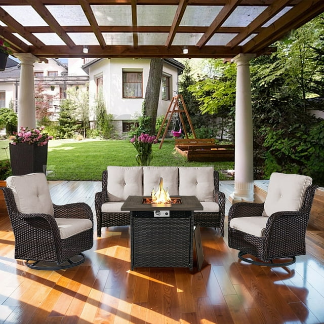 PARKWELL 4-Piece Outdoor Patio Furniture Set 5-Seat High Back Conversation Set with 30" Fire Pit Table and Swivel Glider for Patio Garden Deck,Brown Wicker Beige Cushions