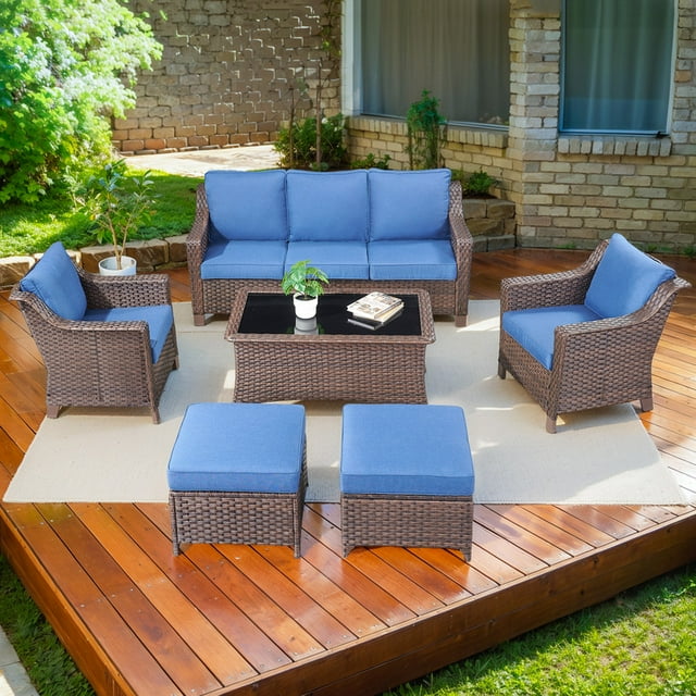 PARKWELL 6 Pieces Outdoor Patio Furniture Set 7-Seat High Back Wicker Conversation Set with Patio Chairs and Coffee Table for Balcony Yard,Brown Wicker Navy Cushion