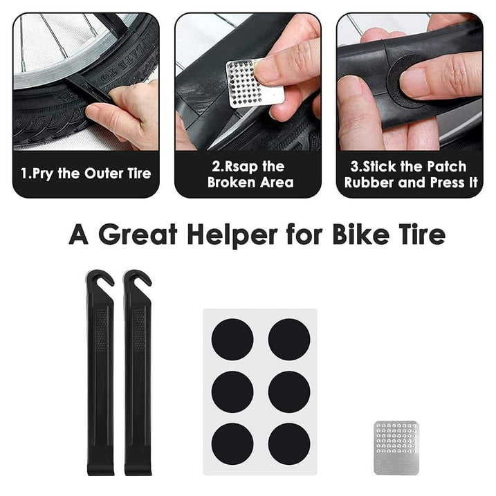 - Glueless Puncture Kit --- 6 Self-adhesive instant repair patches help to get prepared for a flat tire anywhere and anytime. Simply roughen tube lightly with the metal rasp, then clean, then apply the patch, and you can restart!