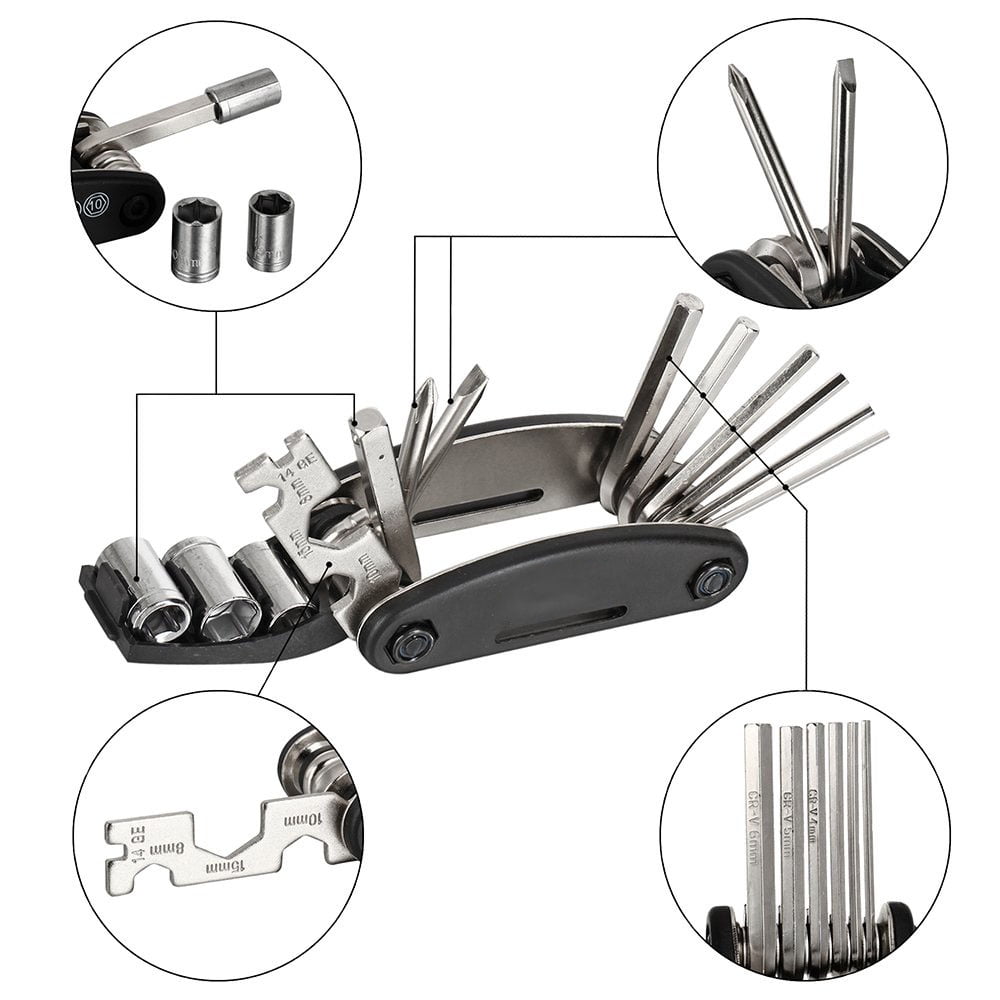 - Riding Companion --- Equipped with Allen / Hex key (mm): 2 | 2.5 | 3 | 4 | 5 | 6 , Socket Hex Wrench (mm): 8 | 9 | 10 and a Socket Extension Rod, Flat Wrench (mm): 8 | 10 | 15, Spoke gauge 14GE, Slot Screwdriver, and Phillips Cross Drive, Rongsi bike multi function tool kit always have your back in each trip.
