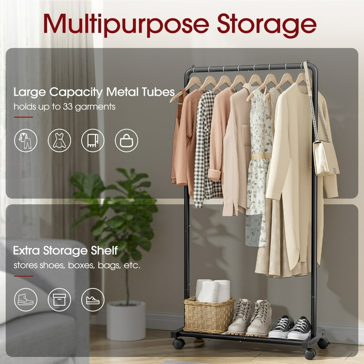 Sakugi Clothes Rack with Wheels, Clothing Racks for Hanging Clothes and Shoes, Black