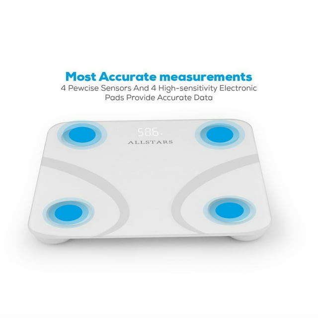 The ALLSTARS Bluetooth body weight scale uses advanced Bio-electrical Impedance Analysis (BIA) technology to measure 12 key body composition metrics, including body weight, BMI, body fat percentage, water percentage, skeletal muscle, fat-free body weight, muscle mass, bone mass, protein, BMR, subcutaneous fat, visceral fat, and metabolic age. This ensures you receive accurate and consistent data. While the scale displays body weight directly, all 13 body metrics are synced via Bluetooth to the FitGo Health App, providing a comprehensive view of your health. Set personalized goals for muscle gain, dieting, or fitness, and track your progress over time—daily, weekly, monthly, and yearly. Share your achievements on social media platforms and connect with other users to exchange experiences. Designed for the whole family, the scale supports up to 8 user profiles.
