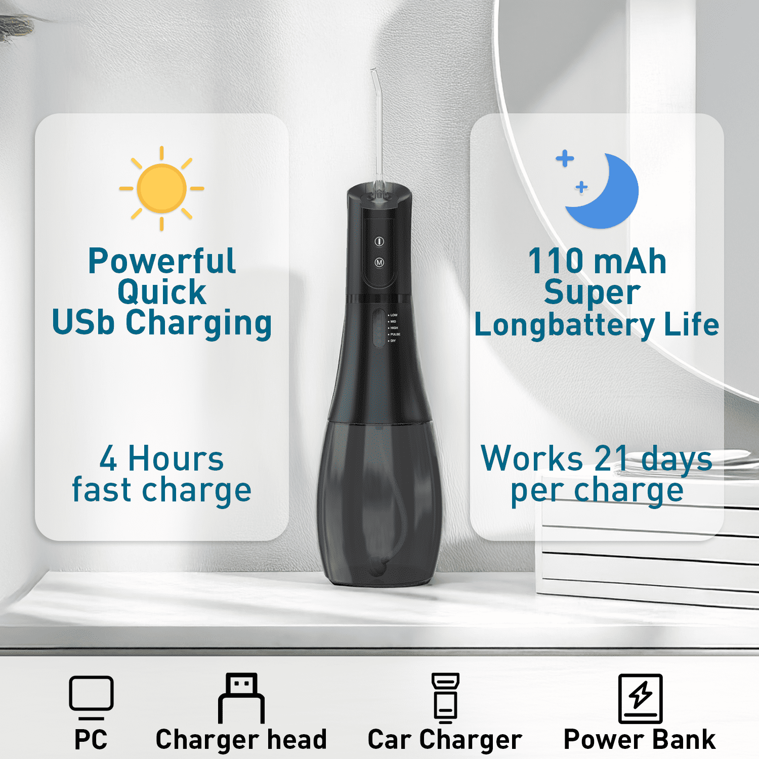 ??【21 Days Long Battery Life】Featuring a built-in large battery, this rechargeable water flosser lasts 21 days on a single 4 hours charge. Includes a USB-C cable (Note: Adapter not included) for convenient on-the-go charging, compatible with power banks, computers, laptops, and more. Lightweight and portable, it offers comfortable usability at home or travel.