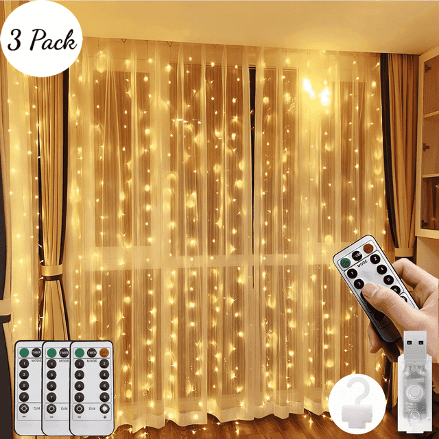 Window Curtain String Light for 3 Pack, ,300 LED Outdoor Indoor Wall Decoration,8 Modes Fairy Lights USB Remote Control Lights,Warm white(9.9x9.9 Ft)